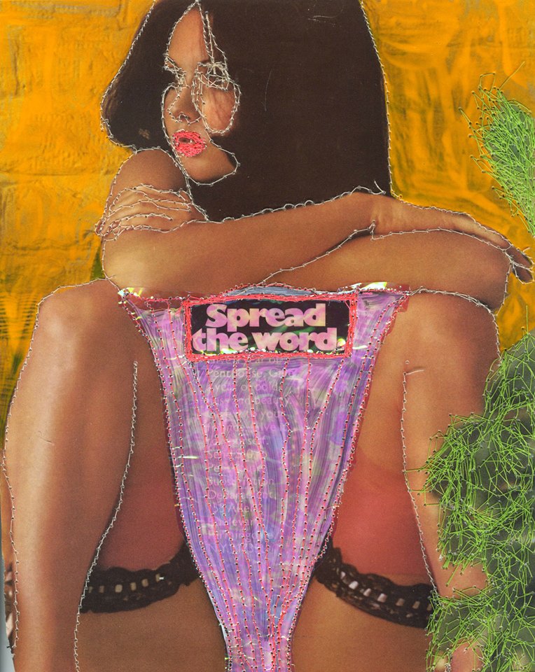 Original piece by Alyx Harch. Acrylic and embroidery on vintage playboy magazine page. 7.5" x 10"